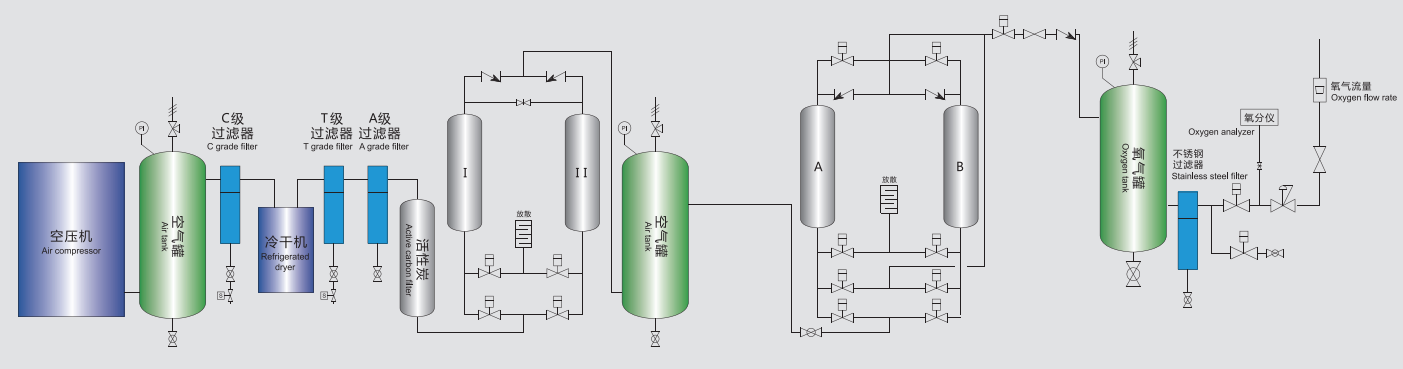 بعد از اینکه هوا توسط کمپرسور هوا فشرده می شود ، پس از برداشتن گرد و غبار ، از بین بردن روغن و خشک شدن ، وارد مخزن ذخیره هوا می شود ، از طریق دریچه مصرف هوا و شیر ورودی سمت چپ وارد برج جذب سمت چپ می شود ، فشار برج بالا می رود ، مولکول های نیتروژن در هوای فشرده شده توسط عربستان مولکول مولکولی و اکتشافی اشخاصی که از طریق آن وجود دارد ، از طریق ارباب مولکولی و اکتشافی جذب می شوند. مخزن ذخیره سازی اکسیژن از طریق شیر تولید گاز سمت چپ و شیر تولید گاز اکسیژن. این فرآیند مکش چپ نامیده می شود. مدت زمان حدود شصت ثانیه است. پس از پایان فرآیند مکش سمت چپ ، برج جذب چپ و برج جذب راست از طریق دریچه برابری فشار به هم وصل می شوند ، به طوری که فشار دو برج متعادل می شود ، این فرایند به تساوی فشار گفته می شود و مدت زمان 3 تا 5 ثانیه است. پس از پایان تساوی فشار ، هوای فشرده شده از طریق شیر ورودی هوا و شیر ورودی سمت راست وارد مخزن اکسیژن می شود. این فرآیند مکش درست نامیده می شود و مدت زمان آن در حدود شصت ثانیه است. در همان زمان ، اکسیژن جذب شده توسط غربال مولکولی زئولیت در برج جذب چپ از طریق کاهش فشار دریچه اگزوز چپ به جو آزاد می شود. در مقابل ، هنگامی که ستون سمت چپ جذب می شود ، ستون سمت راست نیز دفع می شود. به منظور تخلیه کامل نیتروژن آزاد شده از رفع فشار در غربال مولکولی در جو ، اکسیژن از طریق دریچه ضربه معکوس به طور معمول باز به برج جذب دفع منتقل می شود و اکسیژن موجود در برج معکوس از برج جذب خارج می شود. این فرآیند به عنوان ضربه ای نامیده می شود و با دفع آن همراه است. پس از پایان مکش راست ، فرآیند تعادل فشار را وارد کرده و سپس به فرآیند مکش سمت چپ تغییر داده و چرخه را ادامه دهید.